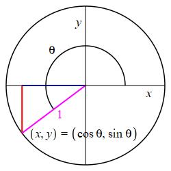 If a point on the unit circle has coordinates \((x,y)\) then: \[ \sin\theta=y \qquad \text{and} \qquad \cos\theta=x \] Conversely, the point on the unit circle at angle \(\theta\) is: \[ (x,y)=(\cos\theta,\sin\theta) \]