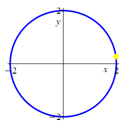 A circle of radius \(2\) can be parametrized as: \[ \vec r(\theta)=\left\langle 2\cos\theta,2\sin\theta\right\rangle \] and graphed as shown. The components are just polar coordinates \((x,y)=(r\cos\theta,r\sin\theta)\) with \(r=2\).