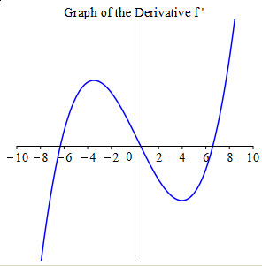\(f'(x)\) switches between negative and positive at each of the points \(-6.32\), \(.49\) and \(6.59\). This means \(f(x)\) alternates between decreasing and increasing at each of these points. This happens in Plot 3.