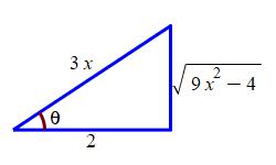 To substitute back, we know \(\sec\theta=\dfrac{3x}{2}\). So: \[\begin{aligned} \tan\theta&=\sqrt{\sec^2\theta-1} =\sqrt{\dfrac{9x^2}{4}-1} \\ &=\dfrac{\sqrt{9x^2-4}}{2} \end{aligned}\] Or we can look at the triangle and conclude \(\tan\theta=\dfrac{\sqrt{9x^2-4}}{2}\).