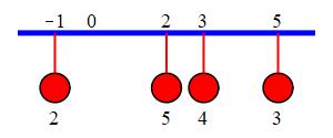Consider a balance beam with several weights (here \(3\)) at various positions. Find the center of mass, \(\bar{x}\), which is the position for the pivot at which the weights are exactly balanced.