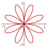 Looking at the rectangular plot, we see there will be a positive loop between \(0\) and \(\dfrac{\pi}{4}\) which reaches \(r=1\), then a negative loop between \(\dfrac{\pi}{4}\) and \(\dfrac{\pi}{2}\). These repeat \(3\) more times. It is important to notice that the negative loops never coincide with the positive loops. So we get an \(8\) leaf rose.