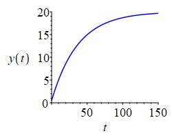 Plugging in both \(A\) and \(k\) to the general solution, we get: \[\begin{aligned} y&=20-19\sqrt{\dfrac{19}{18}}e^{\textstyle -.5\ln\left(\dfrac{19}{18}\right)t} \\ y&=20-19\left(\dfrac{19}{18}\right)^{.5-.5t} \\ \end{aligned}\] The plot for this solution is shown on the right.