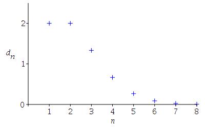 \( \begin{aligned} d_1 &= 2 \\ d_2 &= 4/2!=2 \\ d_3 &= 8/3!=4/3 \\ d_4 &= 16/4!=2/3 \\ d_5 &= 32/5!=4/15 \\ d_6 &= 64/6!=4/45 \\ d_7 &= 128/7!=8/315 \\ d_8 &= 256/8!=2/315 \end{aligned} \)