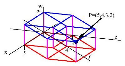 In \(\mathbb{R}^4\), we take the coordinates as \((x,y,z,w)\). We think of \(x\), \(y\) and \(z\) as horizontal and \(w\) as vertical. The figure shows a hypercube in \(\mathbb{R}^4\) whose base is a cube (shown in red) in the horizontal \(xyz\)-hyperplane.