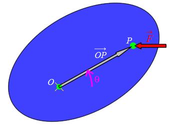 Suppose a rigid object is fixed at a pivot point, \(O\) but is free to rotate about that point. If we push on the object with a force, \(\vec F\), applied at an application point, \(P\), then we are applying the torque: \[ \vec\tau=\vec r\times\vec F \] where \(\vec r=\overrightarrow{OP}\) is the position vector of the application point, \(P\).