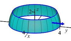 RHS: The boundary, \(\partial P\), is the circle \(x^2+y^2=4\) at \(z=4\). It may be parametrized by setting \(r=2\) in the parametrization of the surface: \[ (x,y,z)=\vec{r}(\theta) =\langle 2\cos\theta,2\sin\theta,4\rangle \] The tangent vector is \[ \vec{v}=(-2\sin\theta,2\cos\theta,0) \] This is counterclockwise, but we need clockwise. So we reverse it: \[ \vec{v}=(2\sin\theta,-2\cos\theta,0) \]